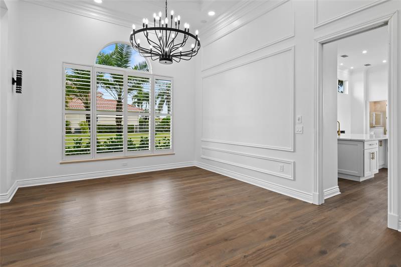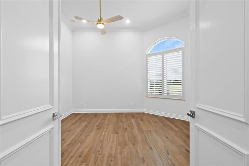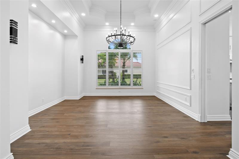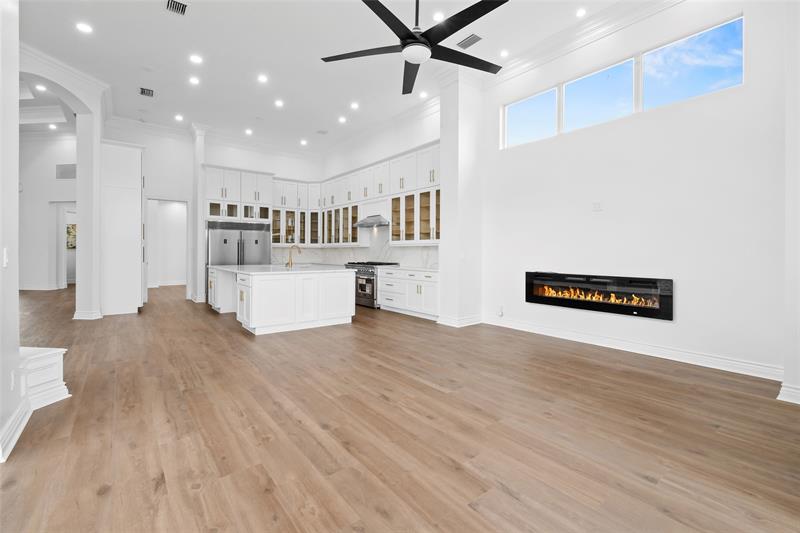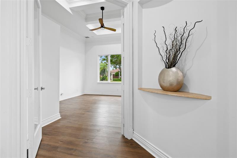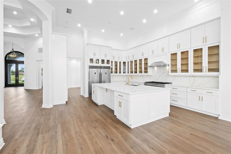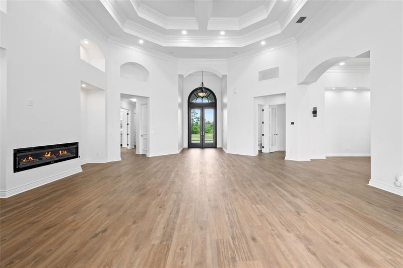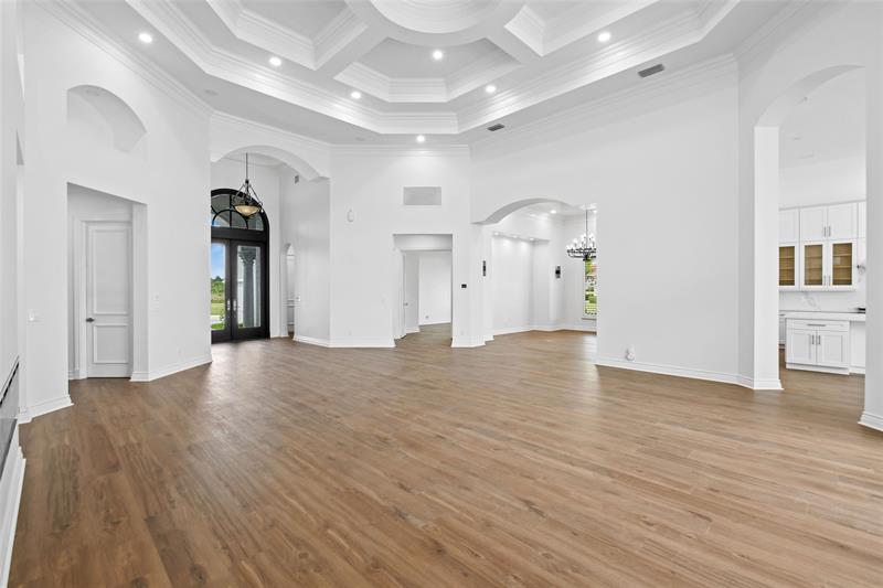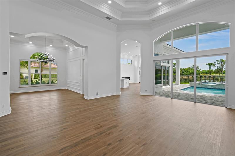 Step through the grand double doors into a sunlit foyer with soaring ceilings and architectural detailing that immediately impresses. The expansive living room opens seamlessly to the pool and golf course beyond, setting a tranquil, resort-like tone.