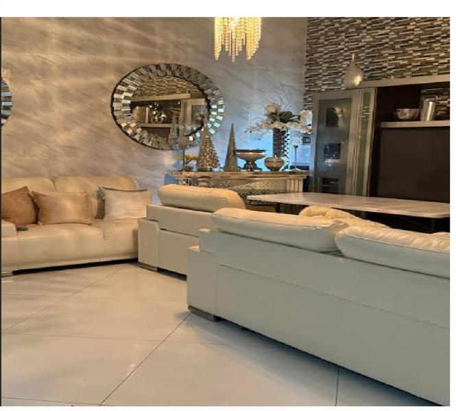 The home boasts 32x32 Alaska White polished porcelain flooring throughout, providing a clean, cohesive, and elegant look. Additional highlights include two extended living rooms, perfect for entertaining and relaxation, 2 convenient car garage.
