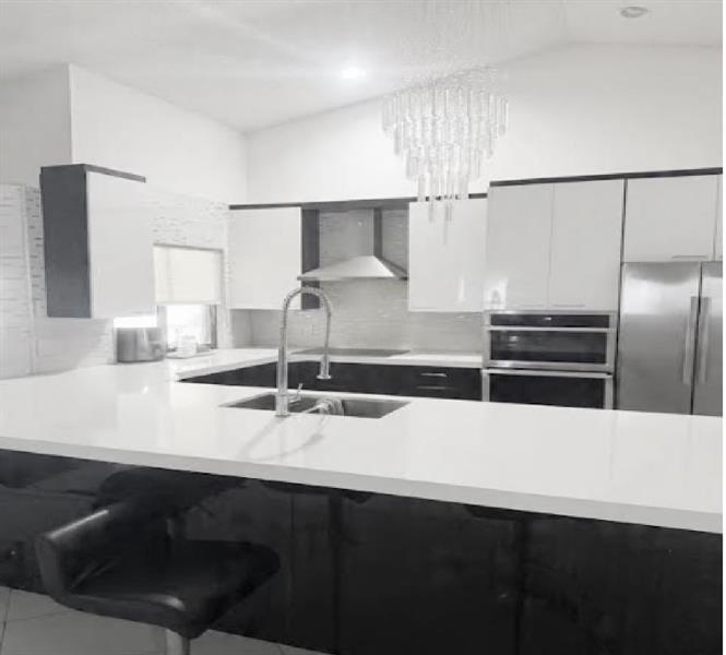 Stunning modern-style home, completely move-in ready. This spacious and well-designed 3-bedroom, 2.5-bath home has been beautifully updated and is ready for your private viewing. All three bedrooms are generously sized, including a large master suite. The fully renovated European-style kitchen features 43-inch two-tone glossy wood cabinets and Italian white quartz countertops, offering a sleek and modern aesthetic. Bathrooms have been upgraded with glass tile finishes and porcelain wall-to-wall accents, creating a luxurious spa-like atmosphere.