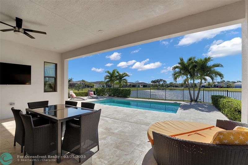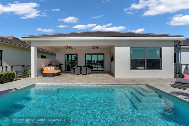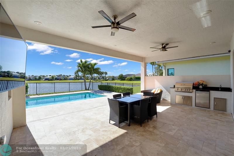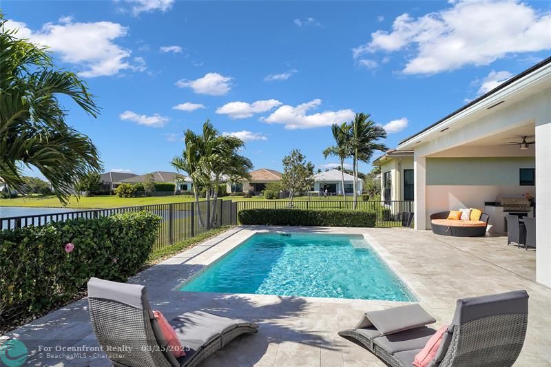 Outdoor kitchen with gas grill, Salt pool & gas pool heater, travertine patio, lighting in the front and back, fenced yard, impact windows.