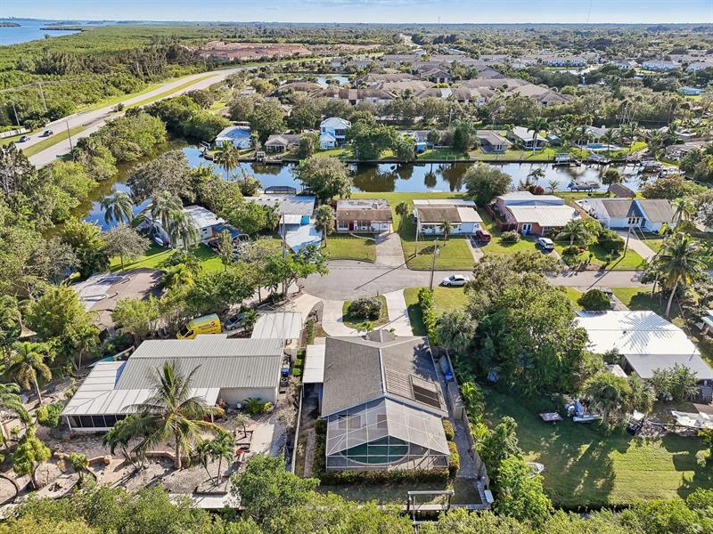 WATERFRONT WITH POOL! BRAND NEW ROOF 11/2025! This tropical retreat is a mariner’s paradise, offering two bedrooms, two bathrooms, and endless charm. Relax by the screened-in, solar-heated pool or enjoy the private dock with a 9,000-pound lift and fish cleaning station. Located at the end of a cul-de-sac, the property features a circular driveway and trailer pad. Fully furnished and move-in ready, just bring your boat! Inside, vaulted ceilings and sliding glass doors lead to a screened lanai with an outdoor shower. Equipped with two en suite bedrooms, an open kitchen, a bonus room, and home security and irrigation systems, this home blends comfort and convenience, just minutes from the beach. Seller financing available with 20% down payment and 6% interest. Don’t wait, this won’t last!