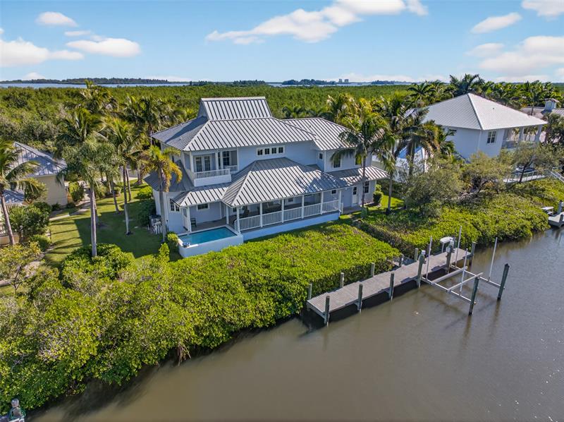 A boater’s dream in gated Riverpoint, this Key West–style home offers 100 ft of deep-water frontage, a 50 ft Trex dock, and a 12,000 lb lift with quick access to the Intracoastal and inlet. Enjoy dolphins, manatees, and birds from your backyard. Outdoor living shines with a heated LED-lit saltwater pool and front and rear porches. Inside features soaring ceilings, an open kitchen with granite and a gas cooktop, bamboo floors, loft, private primary suite, metal roof, new storm shutters, and a 2024 repipe.