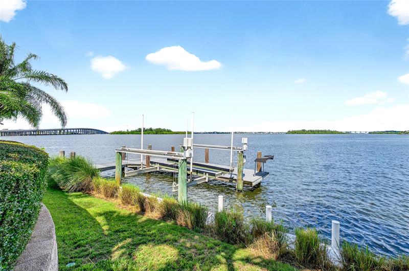 Direct riverfront POINT LOT! 137'+ of deep water frontage with unobstructed views of the Indian River Lagoon. Privately landscaped with feature lighting. On culdesac, NO HOA. Quality CBS construction + hardy board on 2nd level. Reinforced seawall, Trex dock with 9000lb lift equipped with water & electricity plus a fish cleaning station. Premier boating lifestyle, fit for a large craft! 3536SF of light-filled living space and wide water views from every room. Indoor/outdoor entertaining in this spacious 3bed 3.5bath floorplan. Private elevator, Impact windows, heated pool/spa, Flood zone X500.